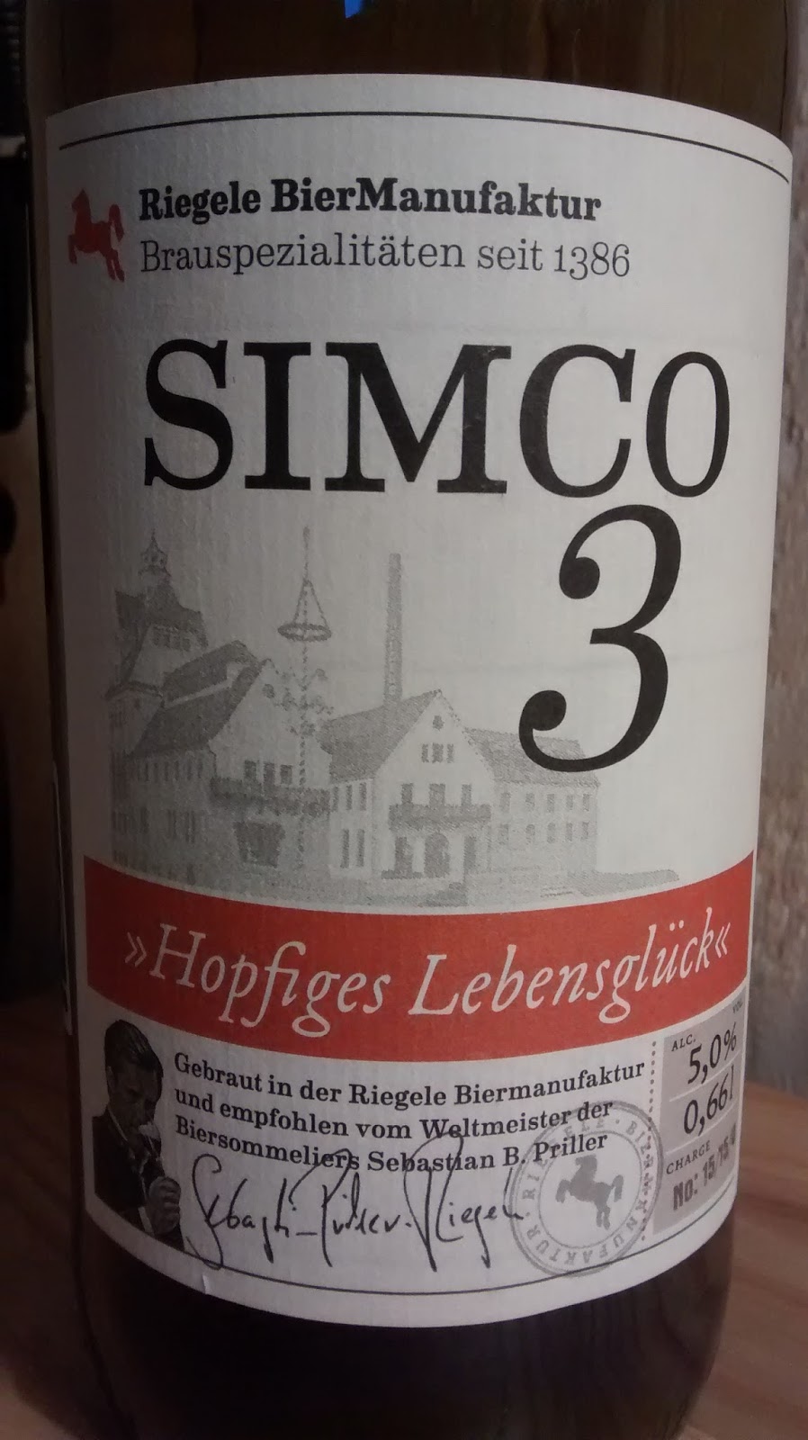 Det er en stor og lidt atypisk flaske. Den er overraskende let af sin størrelse at være. Etiketten har mange informationer, og at den er på tysk gør den ikke nemmere at forstå. Her ses for- og bagetikette og så du nok kan se, sker der helt ufattelig meget på bagetiketten. Det kan godt være at de skulle lære at fatte sig i korthed.