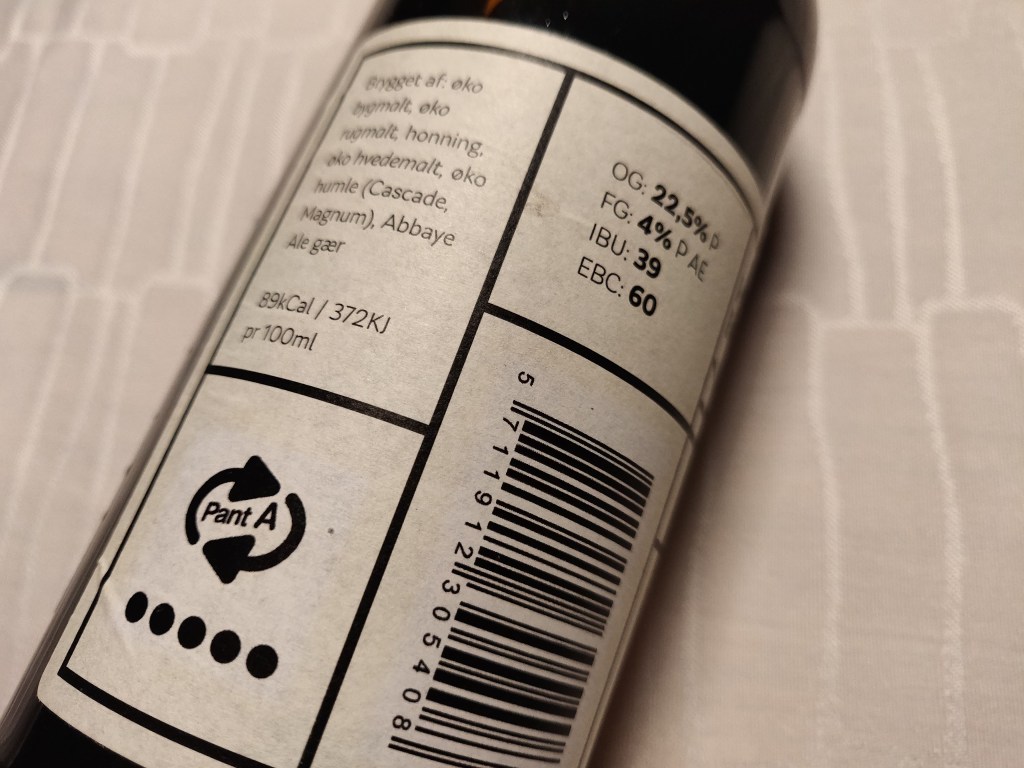 Jubilæums Rugøl 2019 har en oplysningsrig etikette, hvor oplysninger som brygger, brygnr. ibu, ebc, ingrediensliste osv er fremhævet. Det er rigtig godt med alle de oplysninger, jo flere jo bedre. Det eneste jeg mangler er en best before, og den er egentlig ret vigtigt.