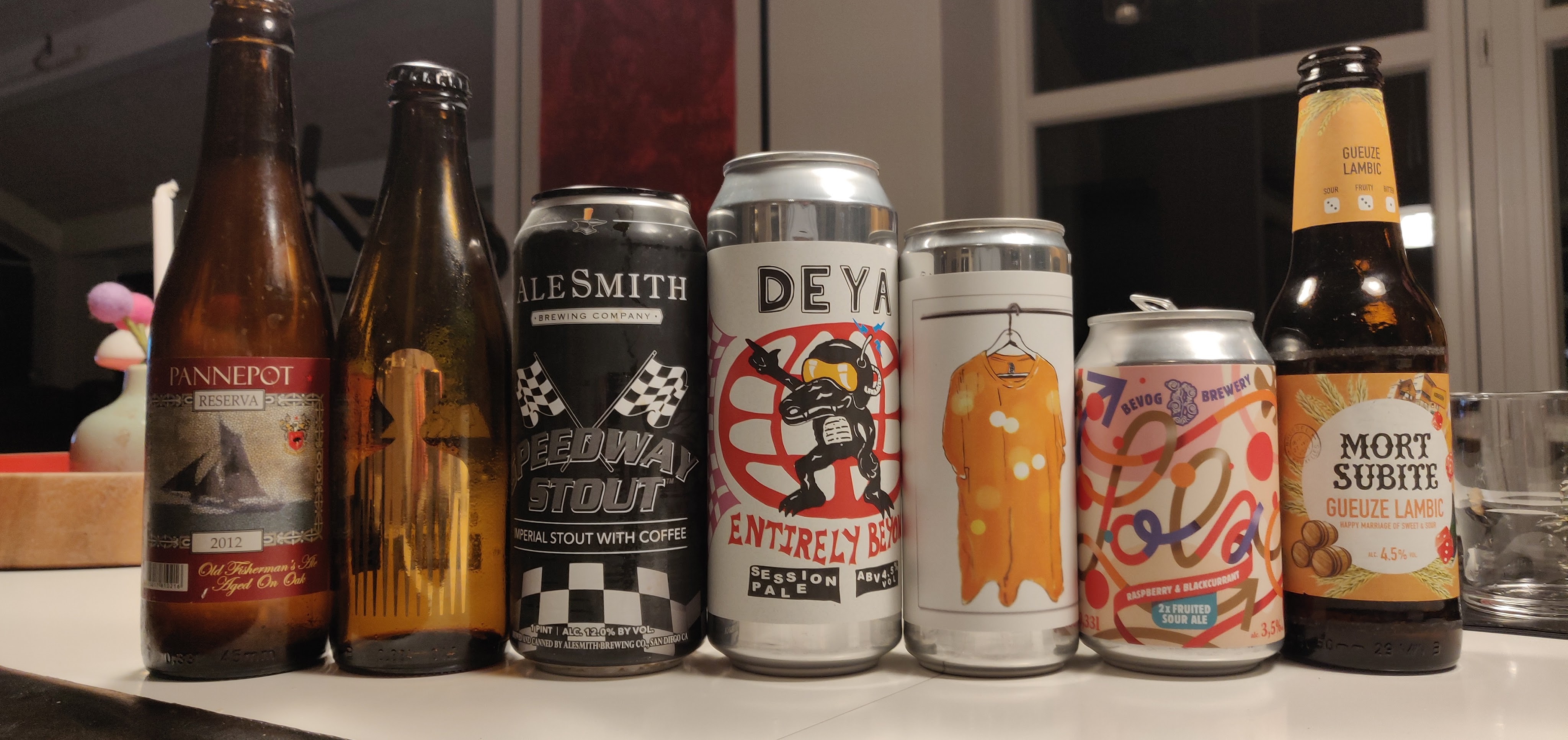 Forleden besøgte jeg Morten Christensen. Morten mødte jeg hos Ølsmageren fra Gjøl, vi faldt i snak og fandt ud at vi næsten bor dør om dør. Vi planlagde en øl-date, og en mandag aften kl. 19, inviterede Morten på øl. Ikke noget vildt, som han skrev, bare en øl eller to. Der gik fire timer, og på den tid havde vi delt syv øl fra Mortens vilde ølsamling, hvor min blegner i forhold til. Herunder kan du se de syv øl vi smagte på.