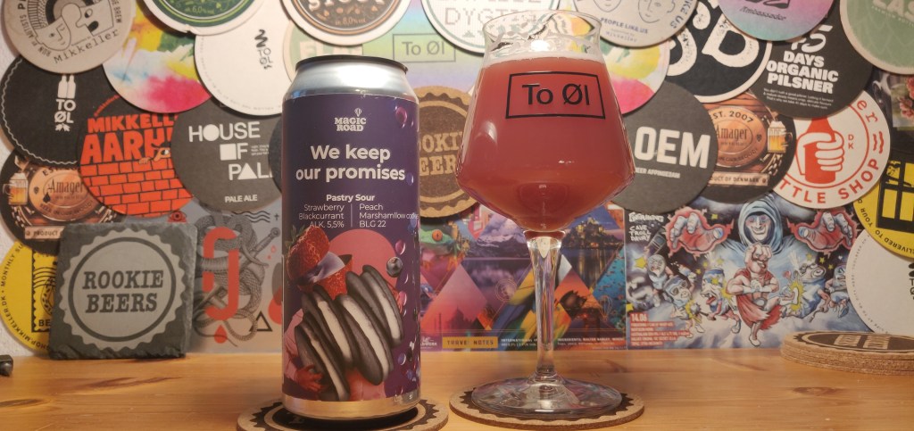 I dag anmelder jeg så endnu en øl fra Magic Road, nemlig deres We Keep Our Promises. En Pastry Sour på 5,5% brygget med vand, bygmalt, hvedeflager, jordbærpure, ferskenpure, solbærpure, laktose, salt, gær og frugtfarve.