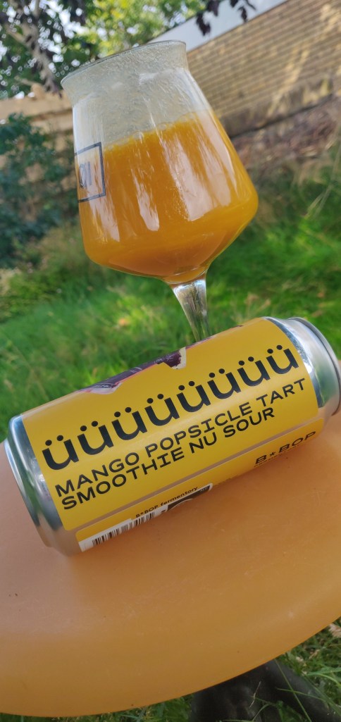 Üüüüüüüü ligner i bedste fald mango sorbet. Det er vældig klistret at kigge på, orange til gult i farven, klæber til kanten og tydelig mangokød kan ses i øllet.