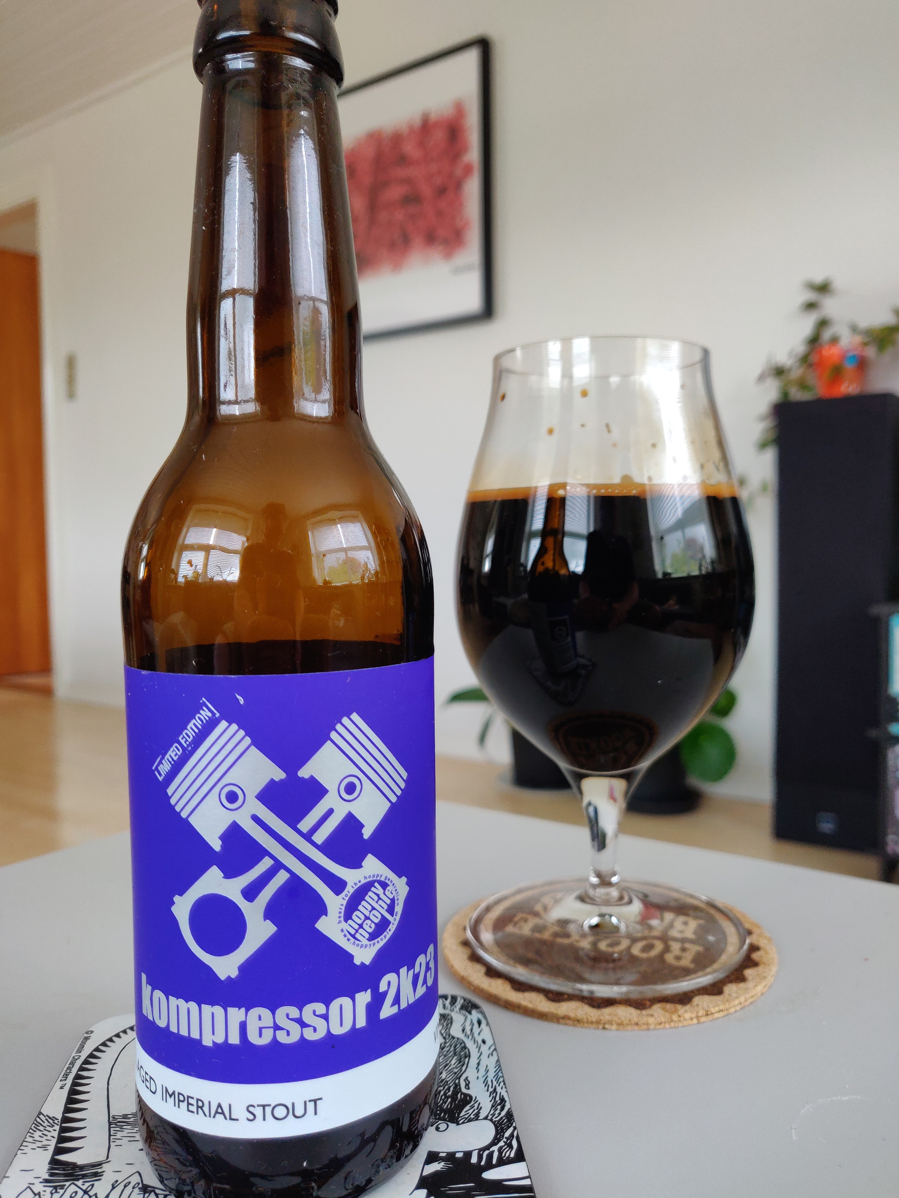Sidst jeg besøgte Ølsmageren fra Gjøl efterspurgte jeg en Imperial Stout med en god fad karakter, som ikke koster over 200 kr. Jesper var ikke sen til at forslå Kompressor 2k23 fra schweiziske Hoppy People.