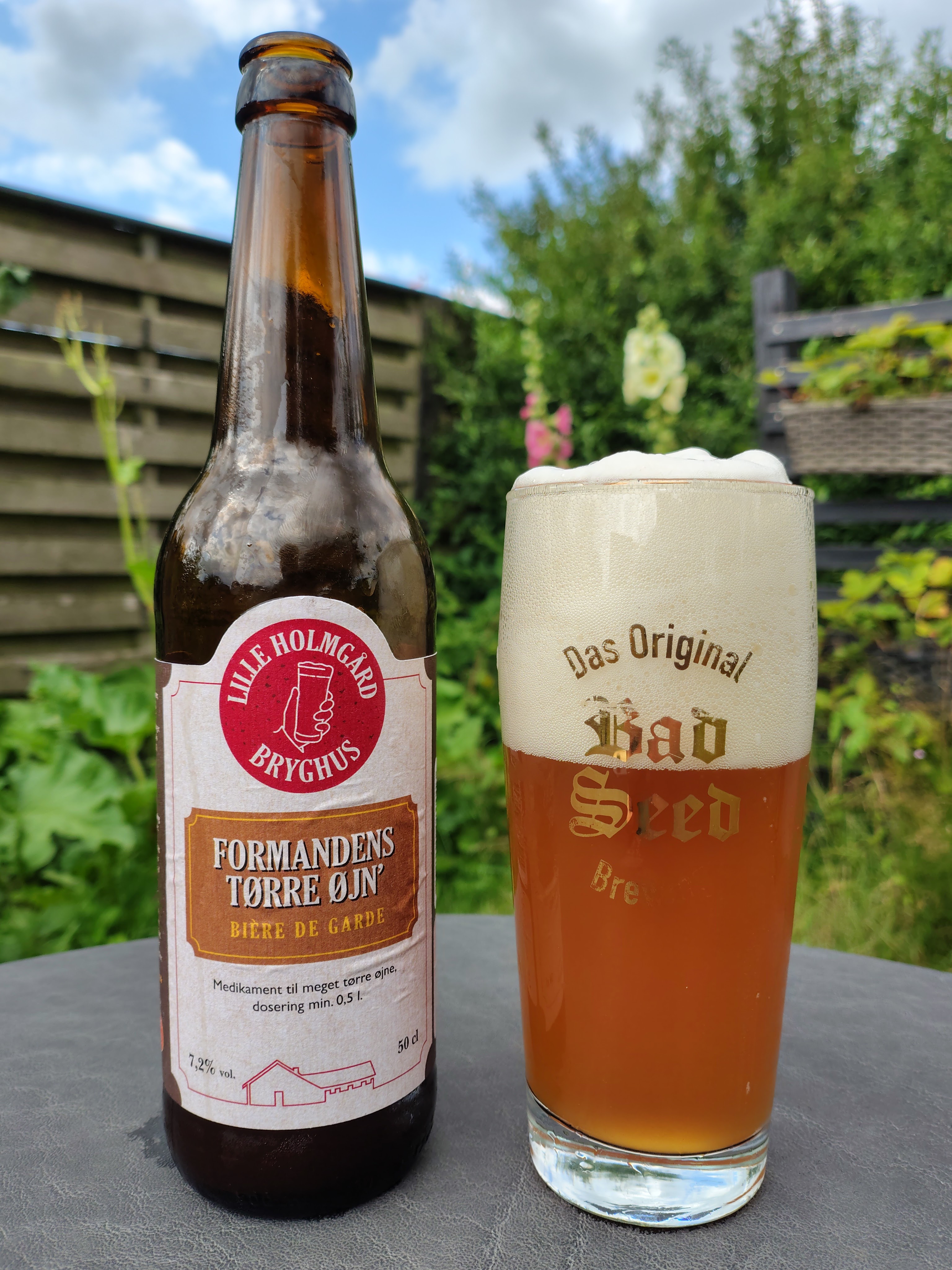 Lille Holmgård Bryghus tapper deres øl på gavmilde 50 cl. flasker, dette er også tilfældet med Formandens Tørre Øjn’.